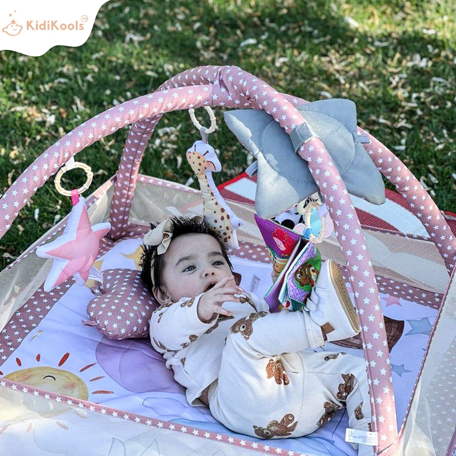 Kidikool's baby play mat engage with hanging toys.